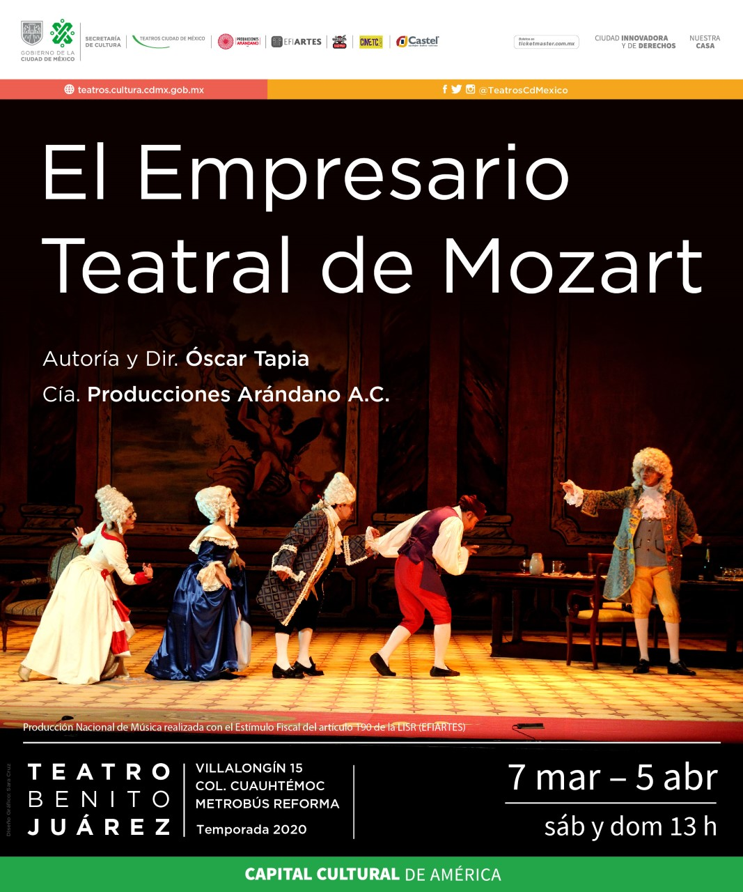 El empresario teatral de Mozart se presenta del 7 de marzo al 5 de abril, en el Teatro Benito Juárez (Villalongín 15, colonia Cuauhtémoc, cerca del Metrobús Reforma), sábados y domingos a las 13:00 horas. Entrada general: 157 pesos. Descuento de 50% a estudiantes de nivel básico, maestros, personas con discapacidad, trabajadores de gobierno e INAPAM con credencial vigente. Sujeto a disponibilidad y aplican restricciones.