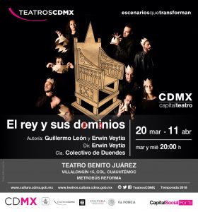 El rey y sus dominios se presentará del 20 de marzo al 11 de abril, martes y miércoles a las 20:00 horas, en el TeatroBenito Juárez (Villalongín 15, colonia Cuauhtémoc, cerca del Metrobús Reforma).