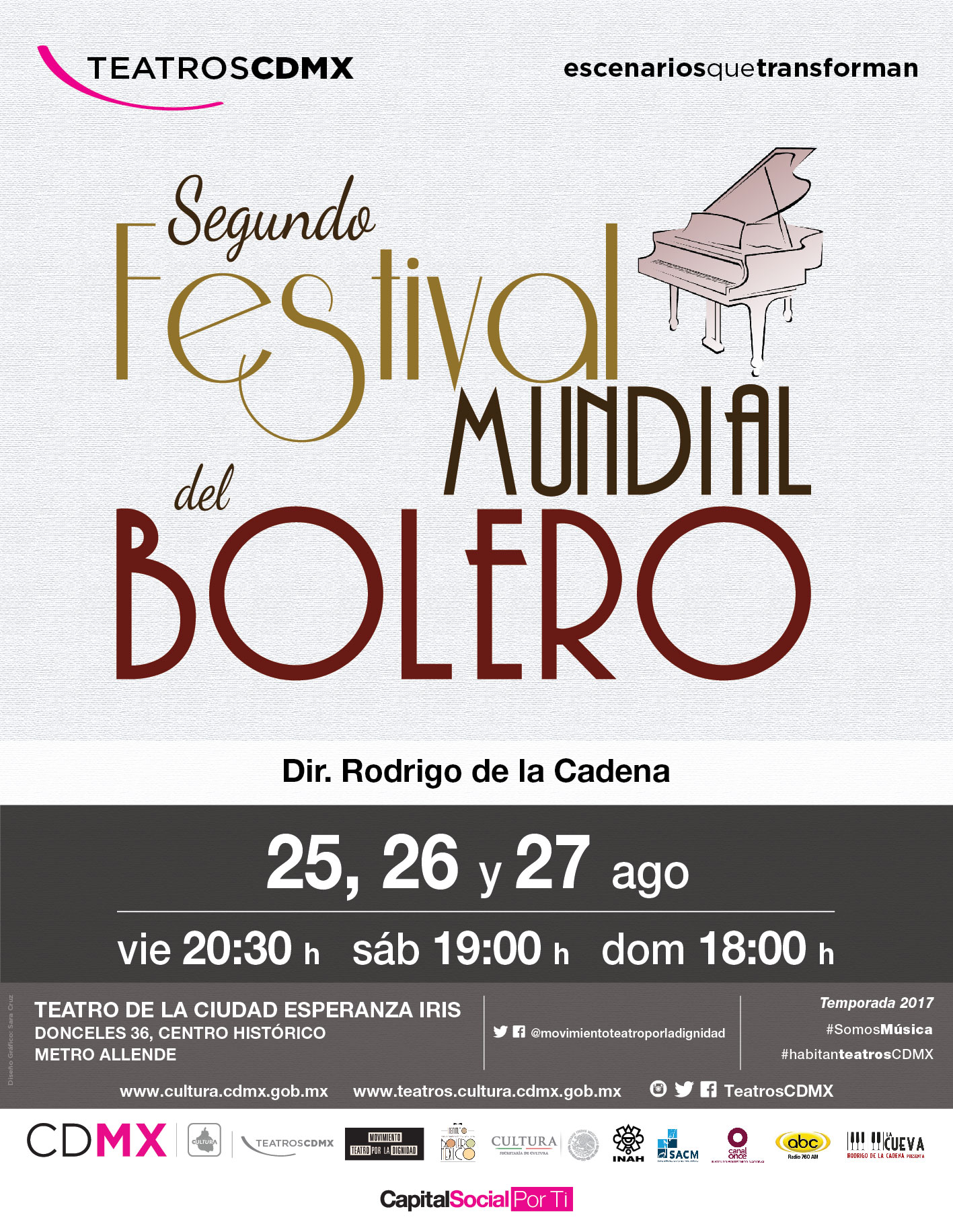 La más importante celebración internacional del bolero y el romanticismo contemporáneo llega al Teatro de la Ciudad Esperanza Iris el viernes 25, sábado 26 y domingo 27 de agosto. Dedicado a Arturo Castro, Los Tres Reyes y Carlos Cuevas, el Segundo Festival Mundial del Bolero en México se desarrolla en tres diferentes conciertos con la participación de más de 40 artistas nacionales e internacionales, entre ellos el trío Los Panchos, Aranza, Alejandra Ávalos y Alberto Ángel “El Cuervo”.